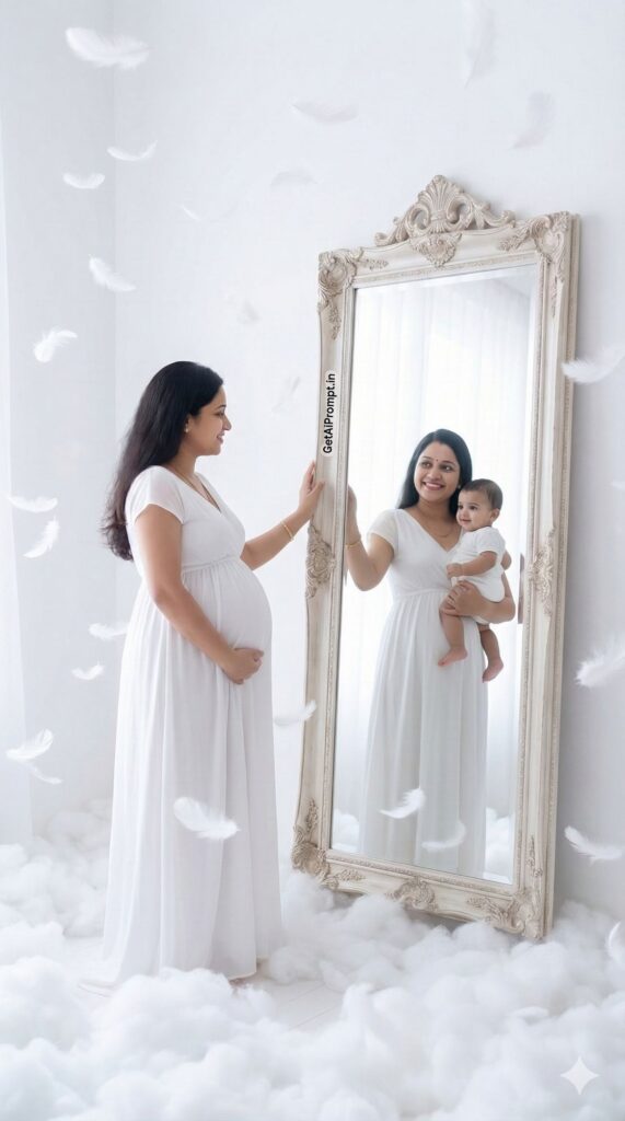 [CRITICAL: ensure the subjects have a 100% identical facial structure, skin tone, and features as the reference image provided] [SHOT TYPE: Surreal artistic composition, split reflection] [SUBJECT:] A pregnant woman standing in front of a large, ornate vintage mirror. In the "real" world, she is pregnant and wearing a simple white gown. [ACTION:] She is touching the mirror glass. The "reflection" in the mirror shows her holding a cute baby (future version) instead of the bump. [BRANDING:] A small sticker on the corner of the mirror frame reads "GetAiPrompt.in". [ENVIRONMENT:] A dreamy, white void room with floating white feathers and soft clouds on the floor. [LIGHTING:] Ethereal, heavenly white glow, soft focus, dreamlike atmosphere but with hyper-realistic facial details. [TECH SPECS:] Dall-E 3 / Midjourney V6 style surrealism, 8K, highly detailed reflection, magical realism, pastel color palette (Baby Pink and Sky Blue). --ar 9:16