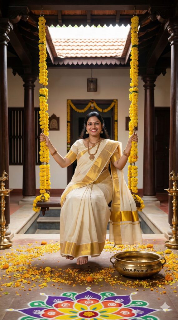 [CRITICAL: ensure the subjects have a 100% identical facial structure, skin tone, and features as the reference image provided] [SHOT TYPE: Full shot showing the swing and the architecture] [SUBJECT:] A pregnant woman sitting on a traditional wooden swing (Oonjal) decorated with marigold garlands. She wears a Kasavu saree (White and Gold) and traditional temple jewelry. [ACTION:] She is swinging gently, smiling, barefoot, feet just touching the flower-petaled floor. [BRANDING:] A small brass vessel on the floor near the swing has "GetAiPrompt.in" engraved on it. [ENVIRONMENT:] Traditional Chettinad house courtyard with wooden pillars, rangoli on the floor, and brass lamps. [LIGHTING:] Natural light filtering from the open roof courtyard, illuminating the gold borders of the saree. [TECH SPECS:] Architectural photography meets portraiture, sharp focus, vibrant colors, 8K resolution, 24mm wide angle, realistic wood textures. --ar 9:16