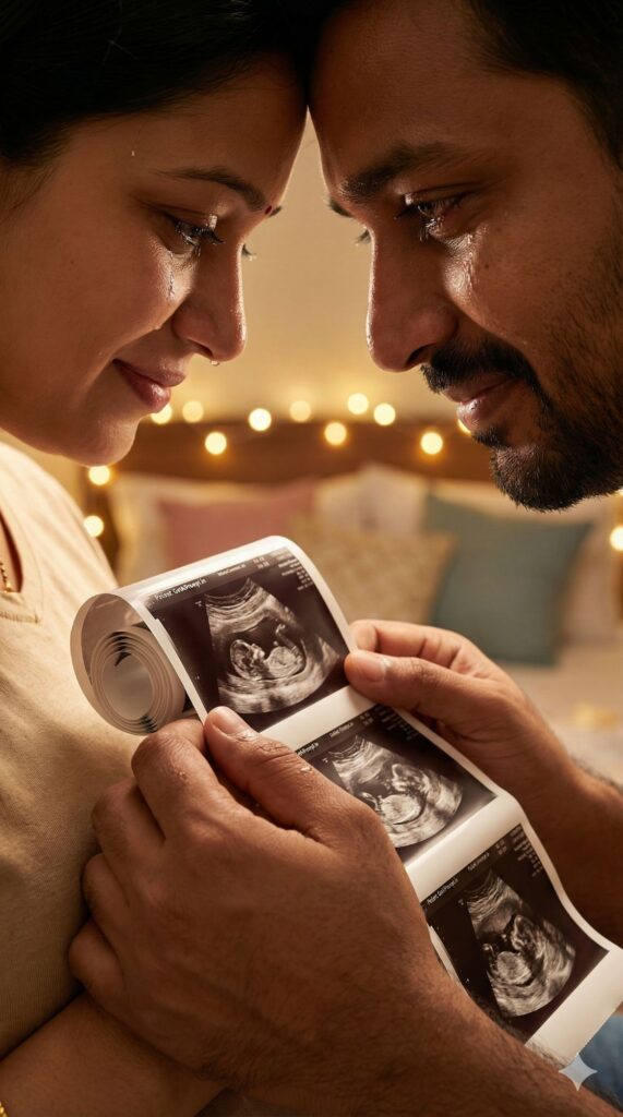 [CRITICAL: ensure the subjects have a 100% identical facial structure, skin tone, and features as the reference image provided] [SHOT TYPE: Extreme Close-up (Macro) focusing on eyes and hands] [SUBJECT:] An Indian couple, heads touching. The focus is on the wife's hands holding an ultrasound strip against her baby bump. The husband's hands are wrapped around hers. [ACTION:] Both have tears of joy in their eyes (happy crying), captured in high detail. [BRANDING:] The ultrasound image has a medical header that subtly lists "Patient: GetAiPrompt.in" instead of a random name. [ENVIRONMENT:] Cozy bedroom setting, blurred background with fairy lights and soft pillows. [LIGHTING:] Warm, cozy indoor lighting (2700K temperature), soft shadows, emphasizing the moisture in the eyes and the texture of the paper. [TECH SPECS:] Macro photography, 100mm lens, f/2.8, emotional storytelling, incredibly detailed skin texture and eyelashes, 8K. --ar 9:16
