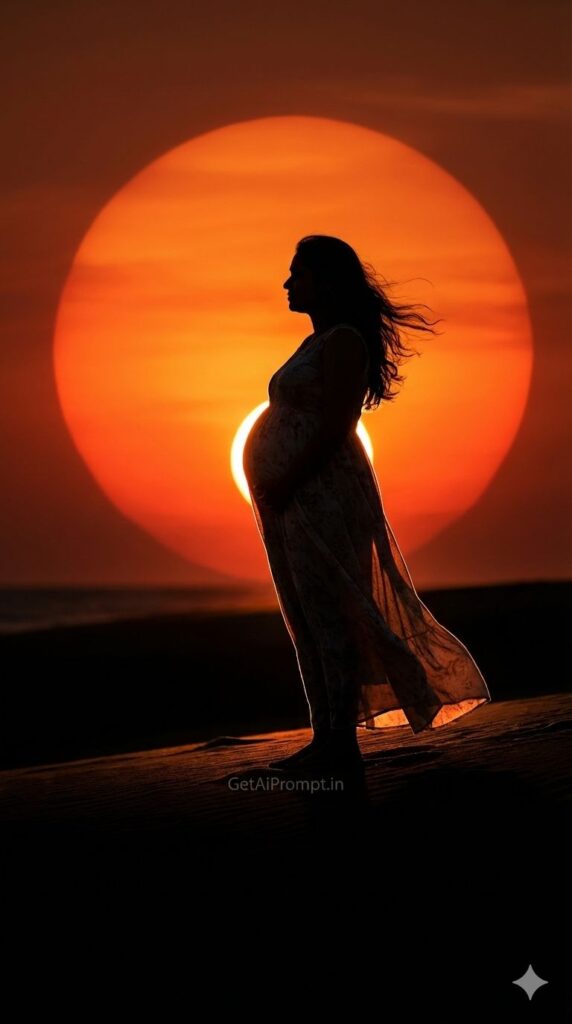 [CRITICAL: ensure the subjects have a 100% identical facial structure, skin tone, and features as the reference image provided] [SHOT TYPE: Silhouette profile shot against a massive sun] [SUBJECT:] The side profile silhouette of a pregnant woman, highlighting the curve of the belly. She is wearing a long flowing maxi dress that is blowing in the wind. [ACTION:] She is standing on a cliff edge or a beach, looking out at the horizon, hair flowing back. [BRANDING:] The text "GetAiPrompt.in" is written in the sand/clouds in a very subtle, transparent watermark style near her feet. [ENVIRONMENT:] An open beach at sunset. The sun is a giant orange orb directly behind her. [LIGHTING:] Strong backlighting, subject is 90% silhouette with a rim light (golden outline) defining her features and the bump. [TECH SPECS:] Fine art photography, high contrast, rich orange and black tones, clean composition, rule of thirds, 8K resolution. --ar 9:16