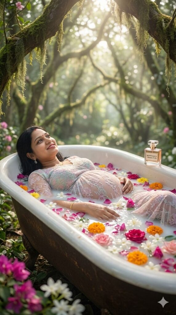 [CRITICAL: ensure the subjects have a 100% identical facial structure, skin tone, and features as the reference image provided] [SHOT TYPE: Medium-long shot, fairytale aesthetic] [SUBJECT:] A pregnant Indian woman looking like a forest goddess, lying inside a large, ornate vintage bathtub overflowing with real flowers (roses, jasmine, marigolds, bougainvillea) and milk. She is wearing a lace pastel gown. [ACTION:] She is looking up dreamily, one hand submerged in the floral water, surrounded by floating petals. [BRANDING:] A small, elegant perfume bottle sitting on the edge of the tub has a label that reads "GetAiPrompt.in - Essence of Life". [ENVIRONMENT:] An enchanted garden setting, moss-covered stone surroundings, dappled sunlight filtering through canopy trees. [LIGHTING:] Ethereal, soft, diffused magical light, creating a soft glow on her skin. [TECH SPECS:] Fantasy portrait photography, highly detailed flower textures, ethereal bokeh, 8K resolution, pastel color grading, dreamy atmosphere. --ar 9:16