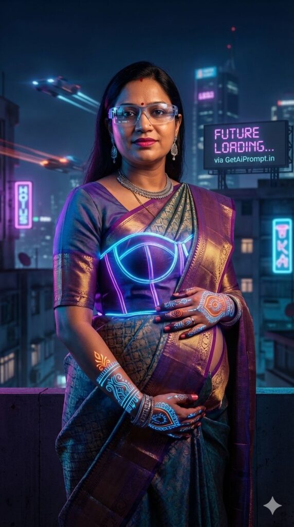 [CRITICAL: ensure the subjects have a 100% identical facial structure, skin tone, and features as the reference image provided] [SHOT TYPE: Fashion portrait, medium shot, high contrast] [SUBJECT:] A pregnant Indian woman in a futuristic fusion outfit: A traditional silk saree draped over a neon-lit corset top. She wears smart glasses and metallic silver jewelry. [ACTION:] Standing confidently against a futuristic cityscape background, holding her bump with hands that have glowing neon mehendi patterns. [BRANDING:] A futuristic digital billboard in the blurred background displays a scrolling text: "FUTURE LOADING... via GetAiPrompt.in". [ENVIRONMENT:] A rooftop at night overlooking a cyberpunk-style Indian city (like futuristic Mumbai), with flying vehicle trails and neon signs. [LIGHTING:] Dual-tone lighting: Blue and purple neon light from the background mixed with a warm key light on her face. [TECH SPECS:] Sci-fi editorial style, sharp focus, vibrant neon colors, incredibly detailed skin texture under colored light, 8K. --ar 9:16