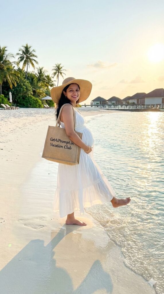 [CRITICAL: ensure the subjects have a 100% identical facial structure, skin tone, and features as the reference image provided] [SHOT TYPE: Full body lifestyle shot, wide angle to show the location] [SUBJECT:] A pregnant Indian woman in a flowing white bohemian maxi dress and a large straw hat, walking on a white sand beach. [ACTION:] She is walking barefoot near the waterline, kicking the water playfully, looking back over her shoulder and smiling at the camera. [BRANDING:] A personalized jute beach tote bag hanging on her shoulder has "GetAiPrompt.in Vacation Club" embroidered on it. [ENVIRONMENT:] A pristine Maldives or Andaman beach with turquoise clear water, overwater villas visible in the distance, and palm trees. [LIGHTING:] Golden Hour sunset light, warm and glowing, creating long shadows and glittering reflections on the water. [TECH SPECS:] Travel influencer photography style, bright and airy, polarized lens effect, high dynamic range, 8K, realistic water texture. --ar 9:16