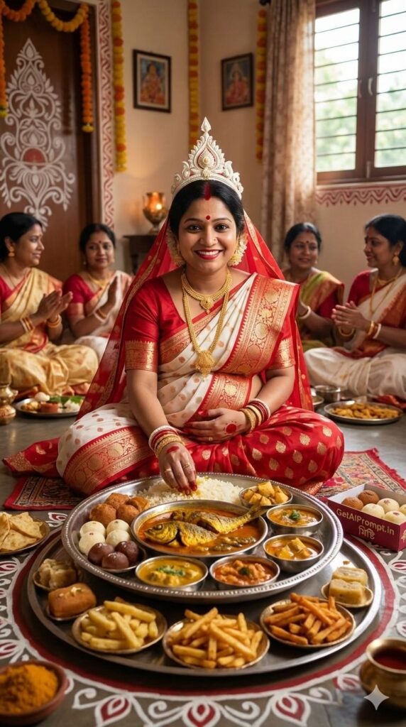 [CRITICAL: ensure the subjects have a 100% identical facial structure, skin tone, and features as the reference image provided] [SHOT TYPE: Eye-level, rich cultural portrait] [SUBJECT:] A pregnant Bengali woman dressed in a traditional red and white Banarasi saree (laal paar sada saree), adorned with gold jewelry and traditional 'shola' (pith) crown. [ACTION:] She is sitting on a decorated floor mat, smiling as she is about to eat from a gigantic silver platter (thali) filled with traditional Bengali dishes (fish, sweets, five types of fries). Her hands have traditional 'alta' red dye. [BRANDING:] A small decorative mishti (sweet) box on the side of the thali has "GetAiPrompt.in Sweets" written in Bengali script. [ENVIRONMENT:] A traditionally decorated Bengali home, background filled with female relatives (blurred) celebrating, alpana art on the floor. [LIGHTING:] Warm indoor lighting mixed with natural window light, highlighting the rich textures of the food and silk. [TECH SPECS:] Documentary cultural photography, vibrant colors, highly detailed food textures, 8K resolution, authentic atmosphere. --ar 9:16