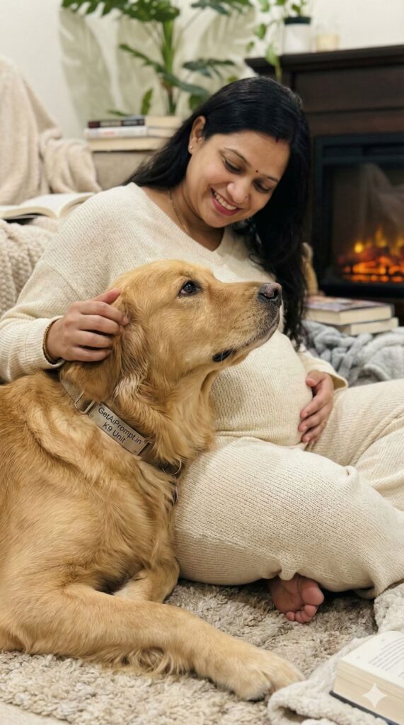 [CRITICAL: ensure the subjects have a 100% identical facial structure, skin tone, and features as the reference image provided] [SHOT TYPE: Low angle, cozy and intimate] [SUBJECT:] A pregnant woman sitting on a plush rug in a cozy living room, wearing comfortable knitted lounge wear. [ACTION:] A large, friendly dog (like a Golden Retriever or an Indian Indie dog) is resting its head gently on her baby bump. The woman is scratching the dog's ears and smiling down at it. [BRANDING:] The dog's collar tag is clearly visible and reads "GetAiPrompt.in K9 Unit". [ENVIRONMENT:] A warm, comfortable living room with soft blankets, books, and indoor plants. Fireplace in the background (optional). [LIGHTING:] Soft, warm indoor ambient light, cozy atmosphere. [TECH SPECS:] Lifestyle photography, shallow depth of field focusing on the dog's face and the bump, sharp fur texture, 8K. --ar 9:16