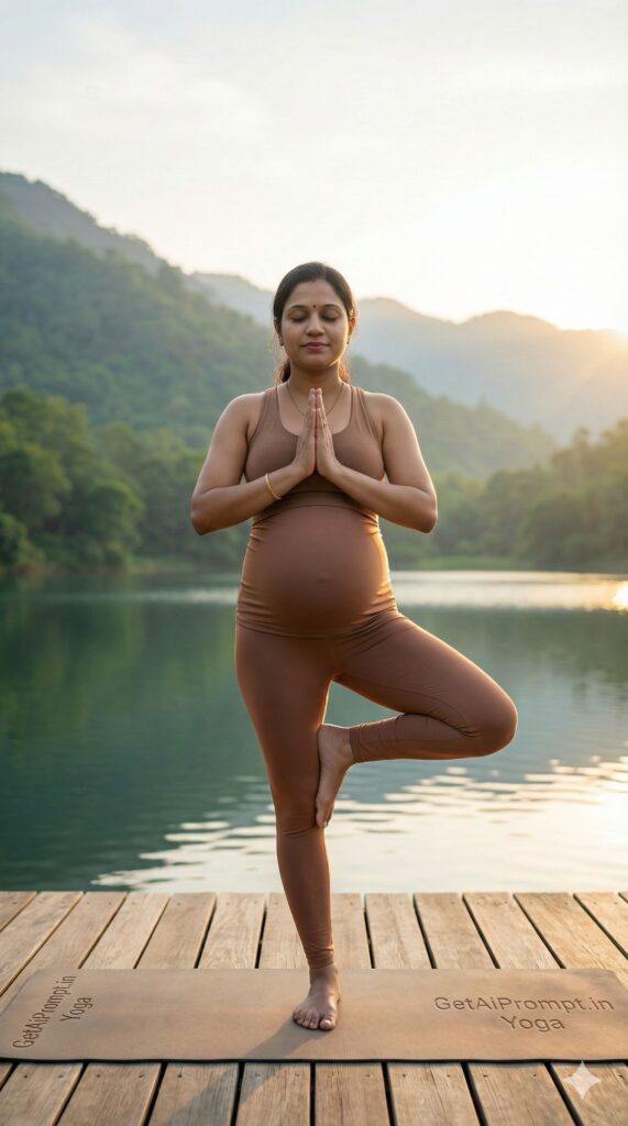 [CRITICAL: ensure the subjects have a 100% identical facial structure, skin tone, and features as the reference image provided] [SHOT TYPE: Full body, serene landscape shot] [SUBJECT:] A pregnant Indian woman in stylish, earthy-toned maternity activewear (yoga leggings and top). [ACTION:] She is holding a perfect 'Tree Pose' (Vrksasana) or a modified prenatal yoga pose on a yoga mat, eyes closed in meditation, hands in prayer position near her chest. [BRANDING:] The yoga mat lying on the floor has the brand logo "GetAiPrompt.in Yoga" embossed on the corner. [ENVIRONMENT:] An outdoor wooden deck overlooking lush green mountains or a serene lake at sunrise. Nature is the hero background. [LIGHTING:] Soft, golden morning light, creating a rim light around her body. Peaceful and calm. [TECH SPECS:] Wellness photography, sharp focus on the subject, natural colors, highly detailed environment, 8K resolution. --ar 9:16