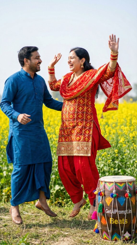[CRITICAL: ensure the subjects have a 100% identical facial structure, skin tone, and features as the reference image provided] [SHOT TYPE: Dynamic mid-shot, frozen action] [SUBJECT:] A fun-loving Punjabi couple. The pregnant woman wears a colorful Phulkari suit, and the husband wears a kurta-chadra. [ACTION:] They are caught mid-action doing a Bhangra dance move, laughing uncontrollably, hands raised in the air. The husband is looking admiringly at his wife's energy. [BRANDING:] A colorful decorated dhol (drum) nearby has "GetAiPrompt.in Beats" painted on its side. [ENVIRONMENT:] An open field in Punjab with mustard flowers (Sarson ke khet) or a vibrant, decorated outdoor sangeet setup. [LIGHTING:] Bright, sunny daylight, vibrant colors popping out. [TECH SPECS:] High-speed photography, sharp focus freezing the motion and flying dupattas, joyful expressions, 8K. --ar 9:16