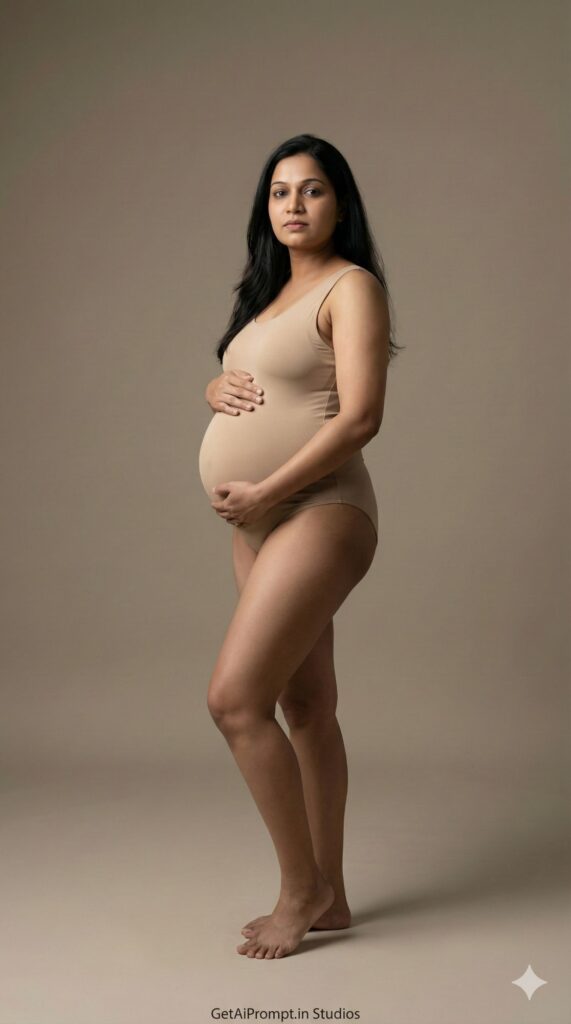 [CRITICAL: ensure the subjects have a 100% identical facial structure, skin tone, and features as the reference image provided] [SHOT TYPE: Full body, architectural composition] [SUBJECT:] A pregnant woman standing statue-esque in a professional studio. She wears a form-fitting, neutral skin-toned (beige or brown) bodysuit that accentuates the bump. [ACTION:] Standing profile or semi-profile, hands elegantly framing the bump, neutral expression, looking powerfully at the camera. [BRANDING:] The seamless studio backdrop floor has a very subtle, high-end fashion watermark "GetAiPrompt.in Studios" near the bottom edge. [ENVIRONMENT:] A completely empty, seamless minimalist studio cyclorama wall (infinity curve) in a muted earth tone. [LIGHTING:] Soft, diffused, professional studio lighting designed to highlight body contours and skin texture. No harsh shadows. [TECH SPECS:] High-fashion editorial style, extremely sharp details, ultra-smooth background, Hasselblad camera quality, 8K. --ar 9:16