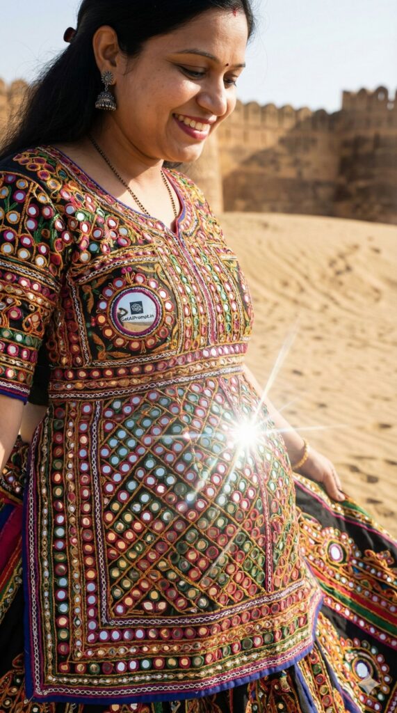 [CRITICAL: ensure the subjects have a 100% identical facial structure, skin tone, and features as the reference image provided] [SHOT TYPE: Medium close-up, focusing on textile details] [SUBJECT:] A pregnant woman from Gujarat or Rajasthan, wearing a heavily embroidered traditional Chaniya Choli designed with thousands of tiny mirrors (abhla bharat). [ACTION:] She is twirling gently, and the camera catches the sunlight reflecting off the mirrors on her belly area. She is smiling broadly. [BRANDING:] One of the larger decorative mirrors embroidered onto her blouse reflects a tiny, distorted image of the "GetAiPrompt.in" logo. [ENVIRONMENT:] A rustic desert setting with sand dunes or an ancient fort wall in the background. [LIGHTING:] harsh bright sunlight creating dazzling reflections (lens flare) from the mirror work. [TECH SPECS:] Texture-focused photography, incredible detail on thread work and mirrors, vibrant colors, 8K resolution. --ar 9:16