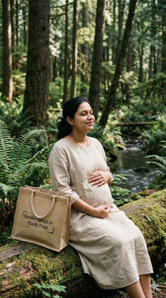 [CRITICAL: ensure the subjects have a 100% identical facial structure, skin tone, and features as the reference image provided] [SHOT TYPE: Candid portrait in nature] [SUBJECT:] A pregnant woman wearing oversized, unstructured organic linen clothing in natural beige/off-white tones. Minimal, natural hair. [ACTION:] She is sitting on a mossy log in a dense forest, holding her bump with both hands, eyes closed, soaking in the nature. [BRANDING:] A reusable jute tote bag next to her has a hand-printed stamp that says "GetAiPrompt.in - Earth First". [ENVIRONMENT:] A lush, dense forest or jungle with ferns, tall trees, and a natural water stream nearby. [LIGHTING:] Dappled sunlight filtering through the dense tree canopy, creating patches of light and shadow. [TECH SPECS:] Analog film photography style (Kodak Portra 800), natural grain, desaturated earthy greens and browns, raw texture, 8K. --ar 9:16
