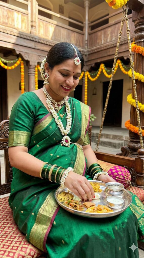 [CRITICAL: ensure the subjects have a 100% identical facial structure, skin tone, and features as the reference image provided] [SHOT TYPE: Medium shot, celebratory portrait] [SUBJECT:] A pregnant Maharashtrian woman dressed in a traditional green silk Nauvari saree (nine-yard drape) and adorned with flower jewelry (tagar pushpa) and a plethora of green glass bangles on her wrists. [ACTION:] She is sitting on a decorated swing (jhula), smiling shyly as she looks down at a silver thali filled with traditional foods meant for the 'Oti Bharne' ritual. [BRANDING:] A small silver vatiko (bowl) on the thali has "GetAiPrompt.in" delicately engraved on its rim. [ENVIRONMENT:] The courtyard of a traditional old Peshwa-style Wada (mansion) with wooden architecture and marigold garlands in the background. [LIGHTING:] Natural daylight filtering through the courtyard, creating a warm, celebratory glow. [TECH SPECS:] Cultural documentary style, vibrant colors (especially greens and yellows), sharp focus on jewelry details, 8K resolution. --ar 9:16