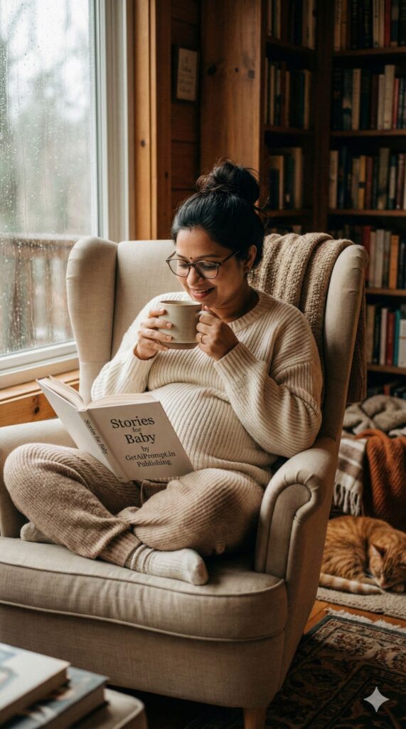 [CRITICAL: ensure the subjects have a 100% identical facial structure, skin tone, and features as the reference image provided] [SHOT TYPE: Candid indoor lifestyle shot] [SUBJECT:] A pregnant woman wearing oversized, comfortable knitted woolen clothing and reading glasses. Her hair is in a messy bun. [ACTION:] She is curled up in a large armchair by a window, sipping from a large mug, with an open book resting on her baby bump. She is smiling softly at the page. [BRANDING:] The spine of the book resting on her belly clearly reads "Stories for Baby by GetAiPrompt.in Publishing". [ENVIRONMENT:] A cozy, rustic home library or study filled with floor-to-ceiling bookshelves, warm blankets, and a sleeping cat in the background. [LIGHTING:] Soft, natural rainy-day light coming from the window beside her. [TECH SPECS:] Warm color grading, film grain texture, cozy atmosphere, shallow depth of field, highly detailed knitwear texture, 8K. --ar 9:16