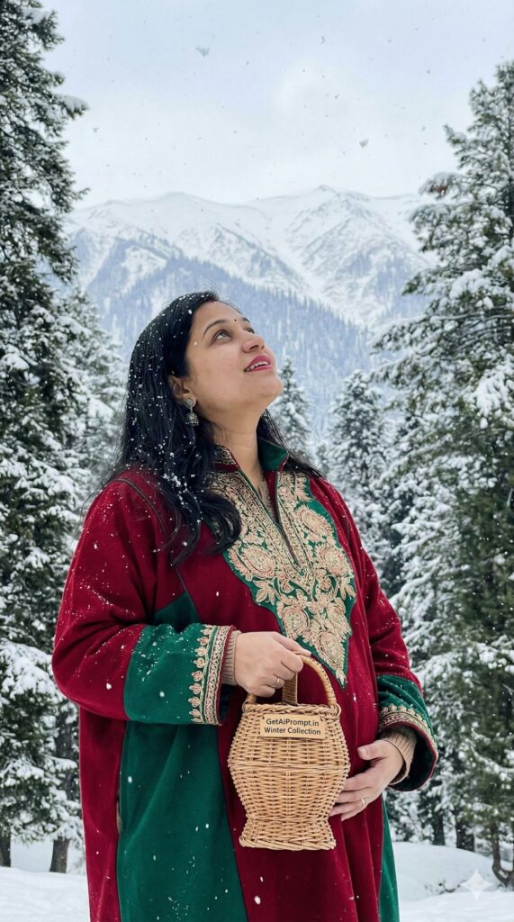 [CRITICAL: ensure the subjects have a 100% identical facial structure, skin tone, and features as the reference image provided] [SHOT TYPE: Majestic outdoor landscape portrait] [SUBJECT:] A pregnant woman wrapped in a luxurious, heavily embroidered Kashmiri Pheran (traditional woolen garment) in deep jewel tones, holding a warm Kangri (fire pot) basket carefully near her bump. [ACTION:] She is standing amidst snow-covered pine trees, looking up at the falling snowflakes with a look of wonder. [BRANDING:] A small woven tag on the Kangri basket handle has "GetAiPrompt.in Winter Collection" stitched onto it. [ENVIRONMENT:] A snow-covered landscape in Gulmarg or Pahalgam, Kashmir, with snow-capped Himalayan mountains in the background. [LIGHTING:] Overcast, soft, diffused winter light. The white snow acts as a natural reflector, brightening her face. [TECH SPECS:] National Geographic travel style, crisp cold air feel, high detail on snow texture and embroidery, 8K resolution. --ar 9:16
