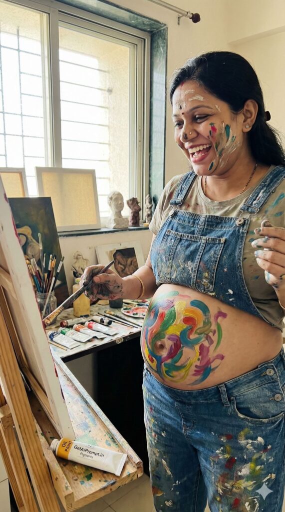 [CRITICAL: ensure the subjects have a 100% identical facial structure, skin tone, and features as the reference image provided] [SHOT TYPE: Mid-shot, action-oriented candid] [SUBJECT:] A pregnant artist (painter or potter) wearing paint-splattered overalls over a t-shirt. Her hands and face have smudges of paint/clay. [ACTION:] She is in her studio, laughing as she paints a colorful abstract design directly onto her bare baby bump, holding a paintbrush. [BRANDING:] A tube of oil paint lying on the easel shelf in the foreground has the brand name "GetAiPrompt.in Pigments". [ENVIRONMENT:] A messy, light-filled art studio cluttered with canvases, brushes, paints, and sculptures. [LIGHTING:] Natural light streaming in from a large studio window, illuminating dust motes and paint textures. [TECH SPECS:] Documentary style, vibrant colors, highly textural (paint, canvas, skin), sharp focus on the action, 8K. --ar 9:16