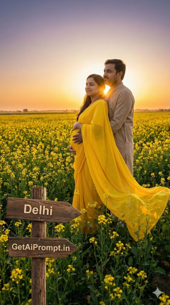 [CRITICAL: ensure the subjects have a 100% identical facial structure, skin tone, and features as the reference image provided] [SHOT TYPE: Wide cinematic shot, capturing the scale of the landscape] [SUBJECT:] An Indian couple. The pregnant woman wears a flowing bright yellow or mustard chiffon saree, and the husband wears a casual kurta. [ACTION:] They are standing in the middle of a vast mustard field (Sarson ke khet) in full bloom. The husband is embracing her from behind, both looking at the sunset. [BRANDING:] A small, rustic wooden signpost stuck in the ground near them playfully points in two directions: "Delhi" and "GetAiPrompt.in". [ENVIRONMENT:] Endless fields of yellow mustard flowers stretching to the horizon under a dramatic sunset sky. [LIGHTING:] Golden Hour backlighting, creating a beautiful golden rim light around the couple and the flowers. Lens flare effect. [TECH SPECS:] Cinematic movie still quality, wide dynamic range, vibrant yellow saturation, ultra-detailed landscape, 8K. --ar 9:16