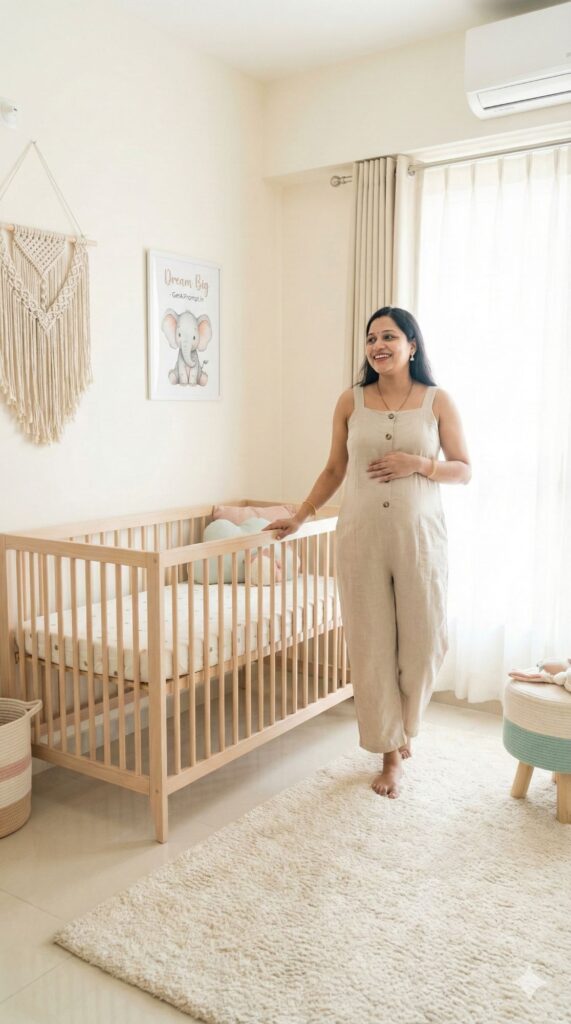 [CRITICAL: ensure the subjects have a 100% identical facial structure, skin tone, and features as the reference image provided] [SHOT TYPE: Wide-angle interior shot] [SUBJECT:] A pregnant woman dressed in stylish, neutral-toned linen clothing. [ACTION:] She is standing in a beautifully decorated, finished baby nursery, one hand on her bump, looking around the room with a satisfied, happy smile. [BRANDING:] A cute, framed wall art piece above the crib features an illustration of an elephant with the text "Dream Big - GetAiPrompt.in". [ENVIRONMENT:] A modern, scandi-boho style nursery with a wooden crib, a macrame wall hanging, a plush rug, and soft pastel colors. [LIGHTING:] Bright, soft, natural light filling the room from a large window. High-key lighting aesthetic. [TECH SPECS:] Interior design photography style, sharp focus on decor details, balanced exposure, clean lines, 8K resolution. --ar 9:16