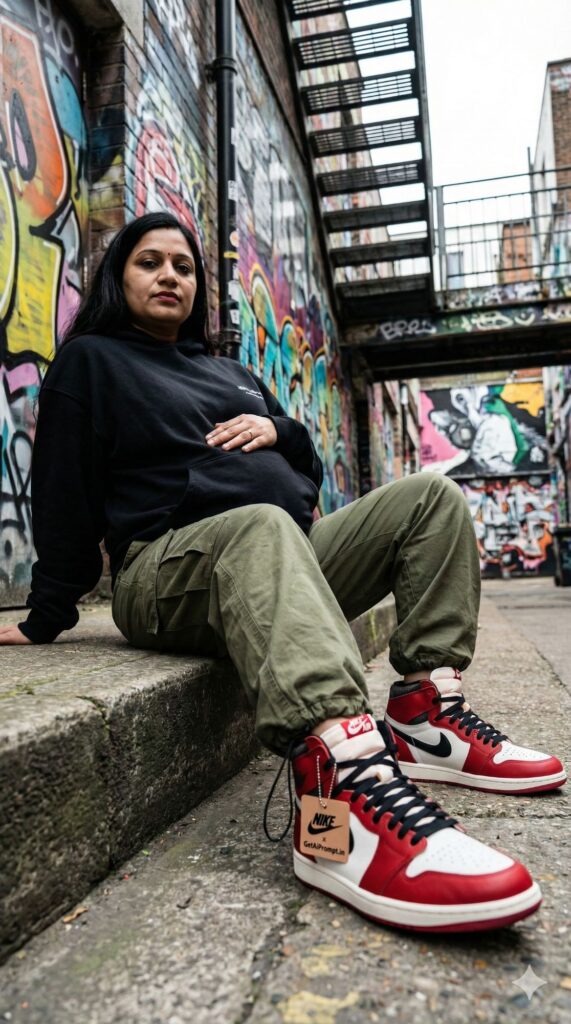 [CRITICAL: ensure the subjects have a 100% identical facial structure, skin tone, and features as the reference image provided] [SHOT TYPE: Low-angle, fashion editorial pose] [SUBJECT:] A pregnant woman with serious swagger, wearing an oversized designer hoodie, baggy cargo pants, and limited-edition hype sneakers (like high-top Jordans). [ACTION:] She is sitting on a concrete step in an urban environment, leaning back casually, one hand resting coolly on her bump. [BRANDING:] The tag hanging off her exclusive sneakers clearly shows the collaboration logo "NIKE x GetAiPrompt.in". [ENVIRONMENT:] An edgy urban alleyway with colorful graffiti art on the walls and a metal staircase. [LIGHTING:] Overcast day, diffused flat light that highlights the textures of the streetwear fabrics and the graffiti. [TECH SPECS:] Hypebeast magazine style, sharp focus, gritty textures, high contrast, highly detailed sneaker rendering, 8K. --ar 9:16