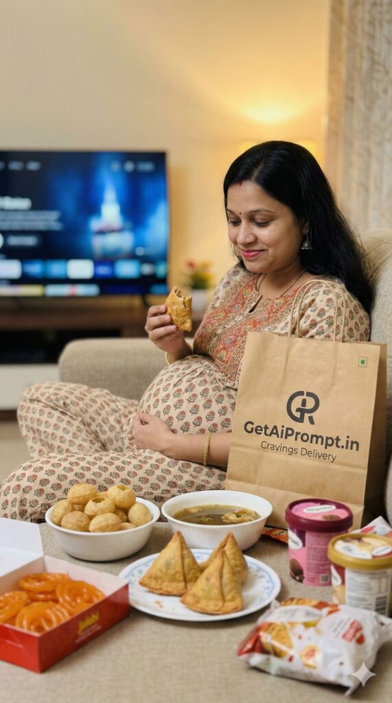 [CRITICAL: ensure the subjects have a 100% identical facial structure, skin tone, and features as the reference image provided] [SHOT TYPE: Mid-shot, playful and slightly messy] [SUBJECT:] A pregnant woman wearing comfortable pajamas, sitting on a couch. [ACTION:] She is surrounded by a ridiculous amount of Indian street food (golgappas, samosas, jalebi boxes, ice cream tubs). She has a guilty but very happy expression, holding a half-eaten samosa near her bump. [BRANDING:] A large takeaway paper bag prominently placed among the food has the logo "GetAiPrompt.in Cravings Delivery". [ENVIRONMENT:] A comfortable living room couch, slightly messy with food wrappers, watching TV (blurred TV screen). [LIGHTING:] cozy indoor evening lighting, warm and inviting. [TECH SPECS:] Lifestyle photography, capturing a candid moment, sharp focus on the food and her expression, 8K resolution. --ar 9:16
