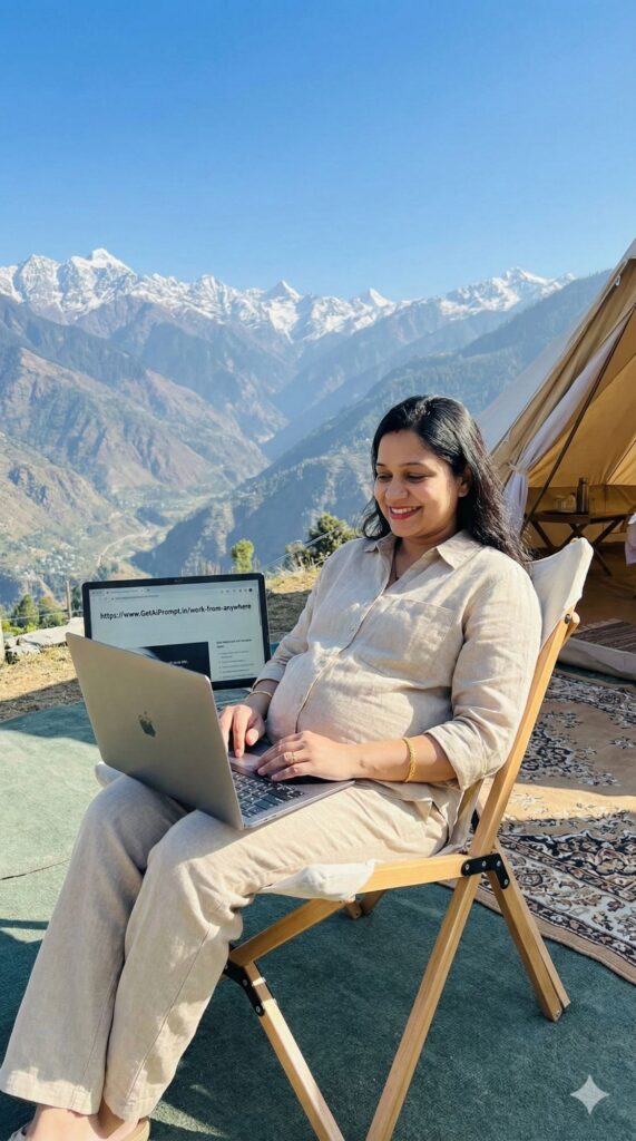 [CRITICAL: ensure the subjects have a 100% identical facial structure, skin tone, and features as the reference image provided] [SHOT TYPE: Lifestyle environmental portrait] [SUBJECT:] A pregnant woman dressed in smart-casual linen wear. [ACTION:] She is sitting comfortably on a glamorous camping chair on a mountain viewpoint, working on a sleek open laptop which is balanced on her knees/bump. She is smiling at the screen. [BRANDING:] The laptop screen is on, and the browser address bar shows the URL "https://www.GetAiPrompt.in/work-from-anywhere". [ENVIRONMENT:] A stunning panoramic mountain viewpoint (like Himachal or Uttarakhand) with a valley below and a luxury glamping tent nearby. [LIGHTING:] Clear sunny day, bright natural light, expansive feel. [TECH SPECS:] Aspirational travel photography, sharp focus on the subject and screen, incredible landscape detail, 8K resolution. --ar 9:16