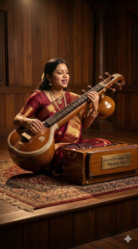 [CRITICAL: ensure the subjects have a 100% identical facial structure, skin tone, and features as the reference image provided] [SHOT TYPE: Low angle, looking up at the subject seated on a dais] [SUBJECT:] A pregnant woman dressed in a classic silk saree, sitting on a rug playing a Tanpura or Veena instrument. She has a serene, meditative expression. [ACTION:] Her fingers are strumming the instrument, and she is singing (mouth slightly open in song). [BRANDING:] The wooden case of the instrument lying next to her has a brass plate engraved with "GetAiPrompt.in Musical Arts". [ENVIRONMENT:] A traditional music room with wooden acoustics, vintage carpets, and warm yellow spotlighting. [LIGHTING:] Moody, dramatic stage lighting focusing on her face and hands, leaving the background in shadow. [TECH SPECS:] Fine art photography, rich wood tones, sharp focus on the instrument strings and jewelry, 8K resolution. --ar 9:16