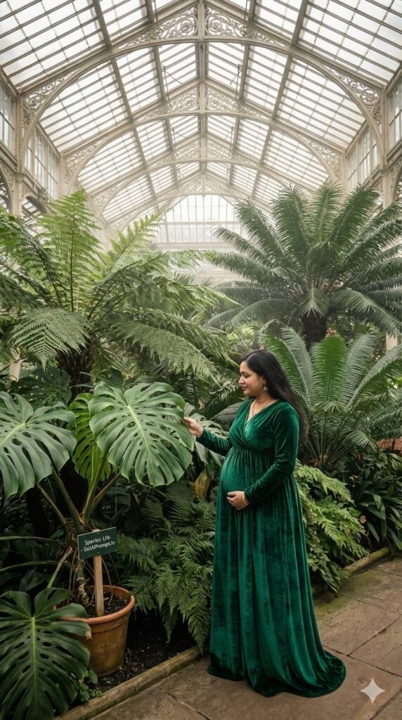 [CRITICAL: ensure the subjects have a 100% identical facial structure, skin tone, and features as the reference image provided] [SHOT TYPE: Wide shot showcasing the architecture and subject] [SUBJECT:] A pregnant woman in a long, flowing emerald green velvet gown. [ACTION:] She is standing inside a vintage Victorian-style glasshouse (conservatory), surrounded by massive exotic ferns and palms. She is touching a large Monstera leaf. [BRANDING:] A small plant marker stake in the soil pot next to her reads "Species: Life - GetAiPrompt.in". [ENVIRONMENT:] intricate glass and metal ceiling structure, lush tropical plants, humid atmosphere. [LIGHTING:] Diffused, soft sunlight filtering through the glass roof, creating soft shadows on the floor. [TECH SPECS:] Architectural fashion photography, rich greens, detailed textures of leaves and velvet, 8K resolution. --ar 9:16