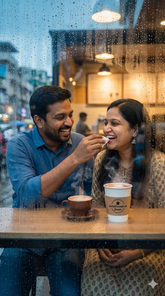 [CRITICAL: ensure the subjects have a 100% identical facial structure, skin tone, and features as the reference image provided] [SHOT TYPE: Through-the-window shot (Voyeuristic angle)] [SUBJECT:] A pregnant couple sitting inside a cozy café, seen through a glass window covered in rain droplets. [ACTION:] They are sharing a hot chocolate; the husband is wiping a bit of foam from her lip, laughing. Condensation on the glass frames them. [BRANDING:] The paper coffee cup on the table has the sleeve logo visible: "GetAiPrompt.in Brews". [ENVIRONMENT:] A busy street outside (blurred), warm tungsten lights inside the café, steam rising from the cups. [LIGHTING:] Contrast between the cool blue rainy exterior and the warm amber interior glow. [TECH SPECS:] Cinematic mood, focus on the raindrops in the foreground and the couple in the mid-ground, bokeh, 8K. --ar 9:16
