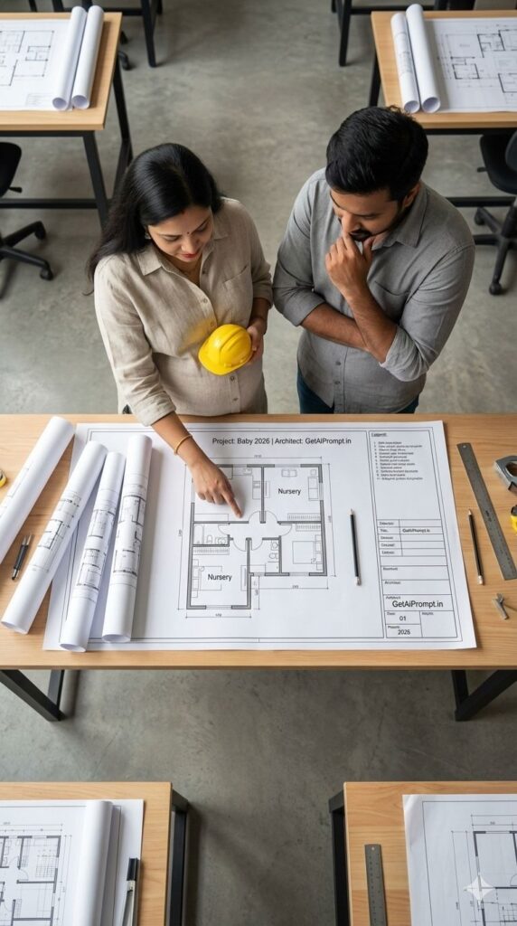 [CRITICAL: ensure the subjects have a 100% identical facial structure, skin tone, and features as the reference image provided] [SHOT TYPE: Overhead flat-lay style or high angle] [SUBJECT:] A couple standing over a table covered in blueprints and building plans. [ACTION:] The pregnant woman is pointing at a section of the blueprint labeled "Nursery". A tiny yellow toy hard hat is resting on her bump. [BRANDING:] The header block on the architectural blueprint paper clearly says "Project: Baby 2026 | Architect: GetAiPrompt.in". [ENVIRONMENT:] A modern architecture studio with concrete walls and drafting tables. [LIGHTING:] Bright, task lighting, sharp and focused. [TECH SPECS:] Commercial lifestyle, high detail on the paper lines and textures, 8K resolution. --ar 9:16