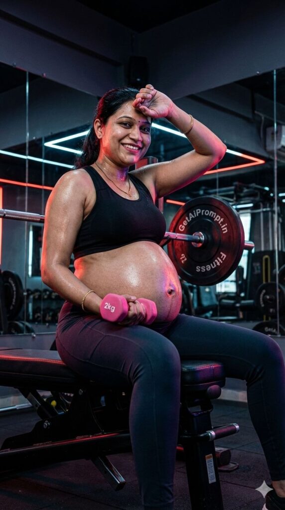 [CRITICAL: ensure the subjects have a 100% identical facial structure, skin tone, and features as the reference image provided] [SHOT TYPE: Low angle, empowering stance] [SUBJECT:] A pregnant woman in high-end athletic wear (sports bra and leggings), showing a defined, strong physique. [ACTION:] She is sitting on a gym bench, holding a small 2kg pink dumbbell next to her bump, wiping sweat from her forehead, smiling confidently. [BRANDING:] The heavy weight plate on the barbell in the background has "GetAiPrompt.in Fitness" embossed on the rubber. [ENVIRONMENT:] A modern, dark-themed gym with neon strip lighting and mirrors. [LIGHTING:] Dramatic rim lighting (red or blue) outlining her silhouette, highlighting muscle tone and the bump. [TECH SPECS:] Sports photography style, high contrast, gritty texture, sweat details, 8K resolution. --ar 9:16