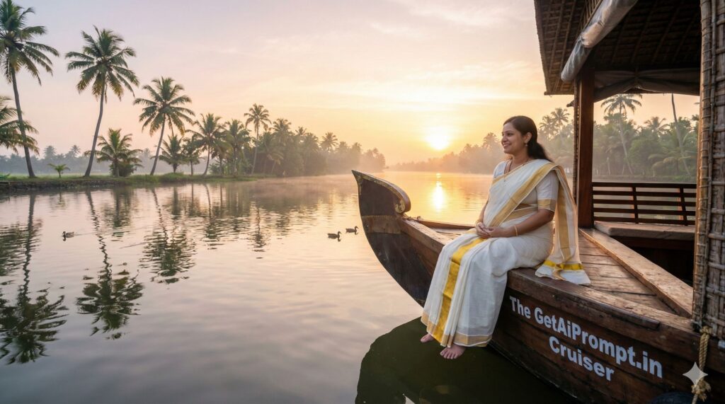 [CRITICAL: ensure the subjects have a 100% identical facial structure, skin tone, and features as the reference image provided] [SHOT TYPE: Wide landscape shot with subject] [SUBJECT:] A pregnant woman wearing a traditional Kerala Kasavu saree (white with gold border). [ACTION:] She is sitting on the deck of a traditional Kettuvallam (houseboat), feet dipping near the water, looking at the palm-lined horizon. [BRANDING:] The name painted on the side of the wooden boat hull is "The GetAiPrompt.in Cruiser". [ENVIRONMENT:] The tranquil Alleppey backwaters, coconut trees reflecting in the water, a few ducks swimming by. [LIGHTING:] Golden Hour sunrise, soft mist over the water, serene and pastel colors. [TECH SPECS:] Travel magazine style, wide dynamic range, realistic water reflections, 8K resolution. --ar 9:16