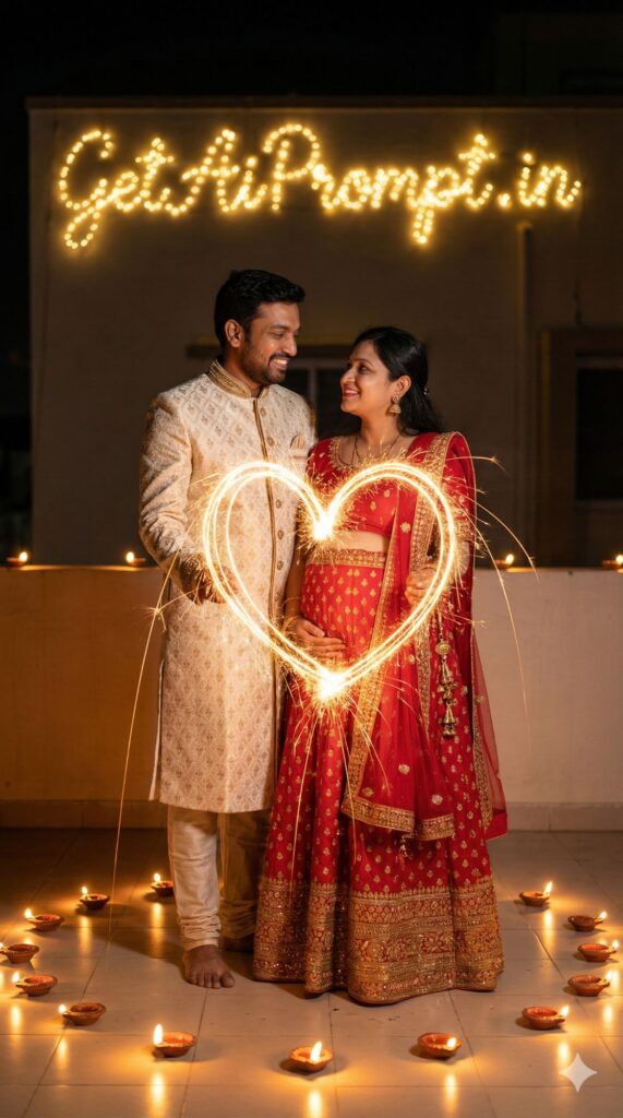 [CRITICAL: ensure the subjects have a 100% identical facial structure, skin tone, and features as the reference image provided] [SHOT TYPE: Long exposure creative shot] [SUBJECT:] An Indian couple dressed in festive ethnic wear (Sherwani and Lehenga) at night. [ACTION:] They are standing still, smiling at each other. Around them, light trails from sparklers (phuljhari) form a glowing heart shape around the baby bump. [BRANDING:] In the background, a string of LED fairy lights on a wall spells out "GetAiPrompt.in" in cursive bokeh. [ENVIRONMENT:] An outdoor garden or terrace decorated for Diwali with diyas on the floor. [LIGHTING:] Dark background, illuminated only by the warm glow of the sparklers and fairy lights. [TECH SPECS:] Long exposure simulation, light painting technique, sharp subject, buttery smooth light trails, 8K. --ar 9:16