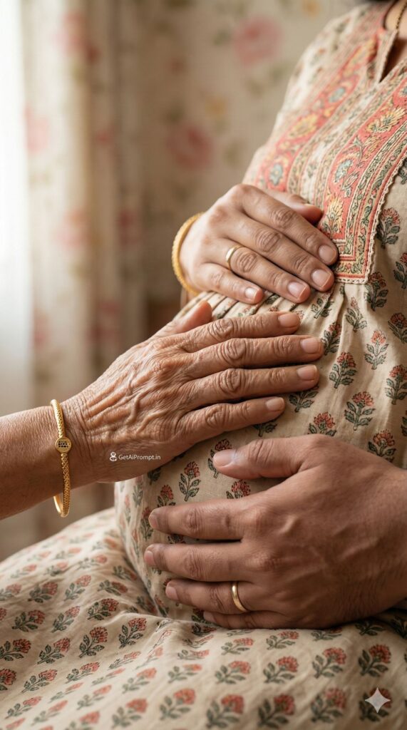 [CRITICAL: ensure the subjects have a 100% identical facial structure, skin tone, and features as the reference image provided] [SHOT TYPE: Close-up on hands (concept shot)] [SUBJECT:] The pregnant woman's belly is the central focus. [ACTION:] Three hands are resting on the bump: The wrinkled hand of the grandmother, the hand of the mother, and the hand of the husband. [BRANDING:] The grandmother is wearing a gold bangle that has a very small, subtle charm attached to it with the logo "GetAiPrompt.in". [ENVIRONMENT:] Blurred background of a warm home setting, perhaps soft floral wallpaper. [LIGHTING:] Soft, diffused window light, focusing entirely on the texture of the skin and the connection of hands. [TECH SPECS:] Macro photography, incredible detail on skin wrinkles and textures, emotional storytelling, 8K. --ar 9:16