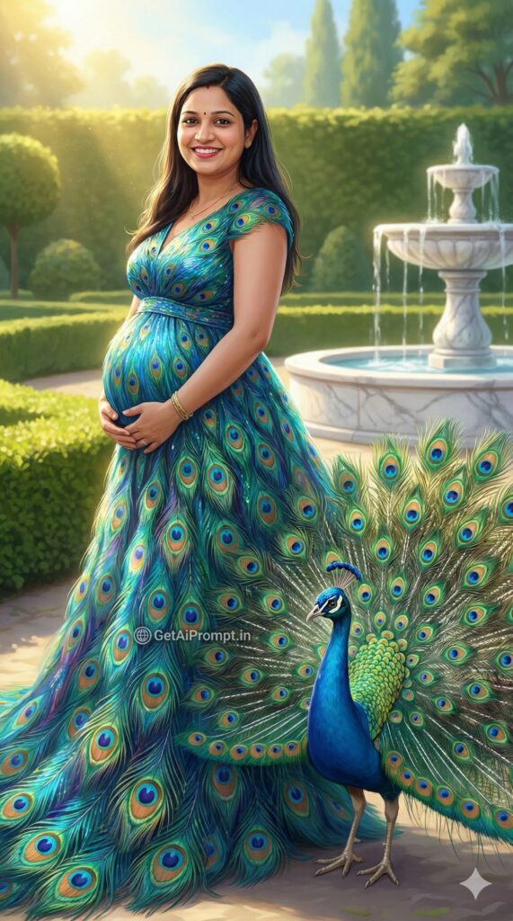 [CRITICAL: ensure the subjects have a 100% identical facial structure, skin tone, and features as the reference image provided] [SHOT TYPE: Artistic fantasy portrait] [SUBJECT:] A pregnant woman wearing a gown made of iridescent peacock feathers (Blues, Greens, Teals). [ACTION:] She is standing in a garden, and a real peacock is standing next to her with its feathers fanned out, mimicking the curve of her dress. [BRANDING:] One of the "eyes" on the peacock feather train subtly morphs into the circular logo of "GetAiPrompt.in". [ENVIRONMENT:] A royal garden with manicured hedges and a marble fountain. [LIGHTING:] Sunlight hitting the iridescent feathers, creating a shimmering effect of blues and greens. [TECH SPECS:] Fantasy art style, high saturation, sharp focus, intricate feather details, 8K resolution. --ar 9:16