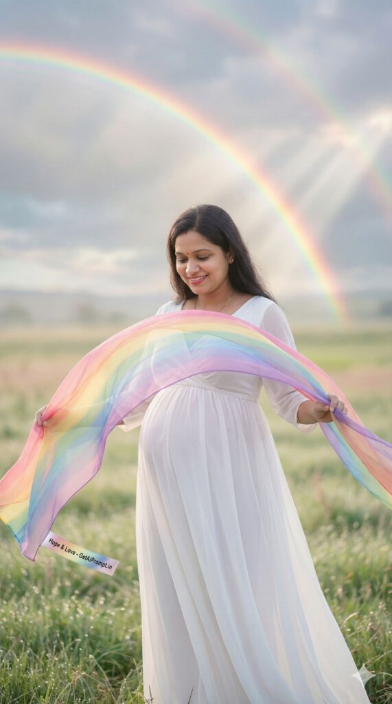[CRITICAL: ensure the subjects have a 100% identical facial structure, skin tone, and features as the reference image provided] [SHOT TYPE: Outdoor nature portrait, soft and airy] [SUBJECT:] A pregnant woman wearing a flowing white chiffon dress. [ACTION:] She is standing in a field, holding a sheer, multi-colored rainbow scarf that blows in the wind, creating an arch over her bump. She is looking at the bump with a peaceful smile. [BRANDING:] The edge of the rainbow scarf has a delicate silk tag fluttering in the wind with the text "Hope & Love - GetAiPrompt.in". [ENVIRONMENT:] A post-rain landscape with a real double rainbow visible in the cloudy sky behind her. [LIGHTING:] Soft, diffused sunlight breaking through storm clouds (The "Tyndall Effect"). [TECH SPECS:] Dreamy aesthetic, pastel colors, soft focus background, emotional storytelling, 8K resolution. --ar 9:16