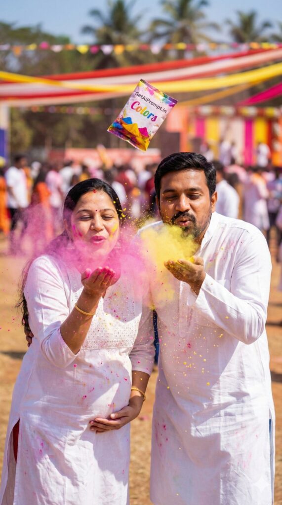 [CRITICAL: ensure the subjects have a 100% identical facial structure, skin tone, and features as the reference image provided] [SHOT TYPE: High-speed action shot] [SUBJECT:] A pregnant couple dressed in white kurtas. [ACTION:] They are blowing pink and yellow Holi color powder (gulal) from their hands towards the camera. The powder creates a colorful cloud around them. They are laughing with eyes closed. [BRANDING:] A packet of color powder flying in the air has the brand logo "GetAiPrompt.in Colors" printed on it. [ENVIRONMENT:] An open outdoor ground, blurred festive background. [LIGHTING:] Bright, harsh sunlight (mid-day feel) making the colors pop and glow. [TECH SPECS:] Fast shutter speed (1/1000s) to freeze the powder particles, high saturation, sharp details on faces, 8K. --ar 9:16