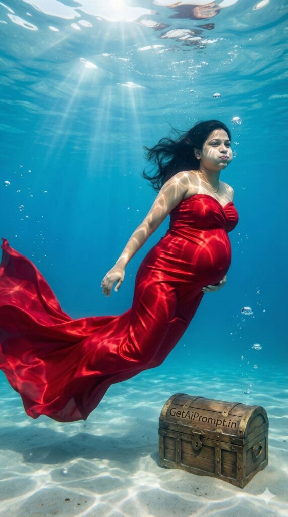 [CRITICAL: ensure the subjects have a 100% identical facial structure, skin tone, and features as the reference image provided] [SHOT TYPE: Underwater wide angle] [SUBJECT:] A pregnant woman swimming underwater, wearing a long, red satin fabric that trails behind her like a mermaid tail. [ACTION:] She is floating weightlessly, holding her breath (cheeks slightly puffed), looking serene. Her hair is floating beautifully around her face. [BRANDING:] A small, ancient-looking treasure chest on the sandy ocean floor has "GetAiPrompt.in" carved into the wood. [ENVIRONMENT:] Clear blue underwater pool or ocean with light rays piercing through the surface water. [LIGHTING:] Caustics (light refraction patterns) dancing on her skin and the fabric. [TECH SPECS:] Underwater photography, crystal clear water, vibrant red vs blue contrast, bubble details, 8K. --ar 9:16