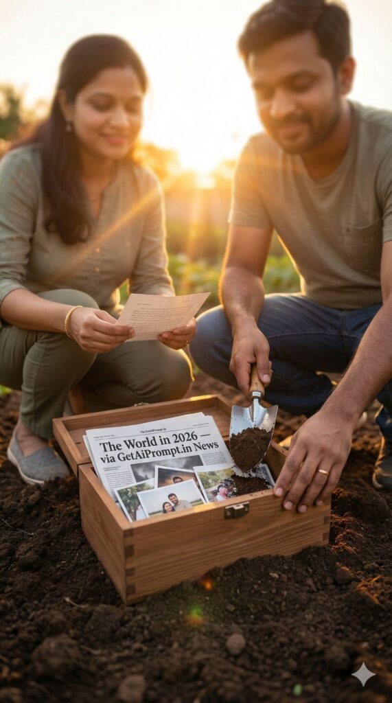 [CRITICAL: ensure the subjects have a 100% identical facial structure, skin tone, and features as the reference image provided] [SHOT TYPE: Eye-level, crouching shot] [SUBJECT:] A pregnant couple crouching in their garden. [ACTION:] They are burying a wooden box (Time Capsule) in the soil. The woman is holding a letter. The box is filled with photos and a newspaper. [BRANDING:] The newspaper visible inside the box has the headline "The World in 2026 - via GetAiPrompt.in News". [ENVIRONMENT:] A home garden with a shovel and fresh soil. Sunset time. [LIGHTING:] Golden hour, warm and nostalgic glow, lens flare. [TECH SPECS:] Storytelling photography, focus on the box and hands, blurred faces in background (optional) or sharp faces, 8K. --ar 9:16
