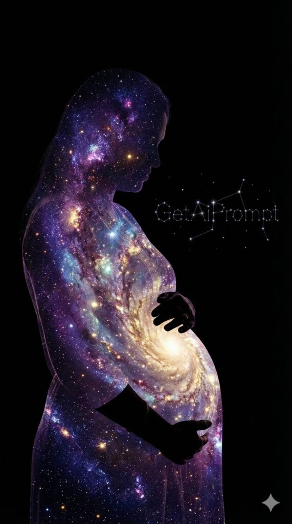 [CRITICAL: ensure the subjects have a 100% identical facial structure, skin tone, and features as the reference image provided] [SHOT TYPE: Artistic double exposure] [SUBJECT:] Silhouette of a pregnant woman. [ACTION:] Instead of skin, her baby bump is filled with a glowing, swirling galaxy (stars, nebulas, purple and blue cosmic dust). She is cradling the universe. [BRANDING:] A constellation of stars in the background subtly connects to form the letters "GetAiPrompt". [ENVIRONMENT:] A pitch black background to highlight the cosmic glow. [LIGHTING:] Bioluminescent internal glow, ethereal and magical. [TECH SPECS:] Digital art / Double exposure photography style, high contrast, vibrant cosmic colors, 8K. --ar 9:16