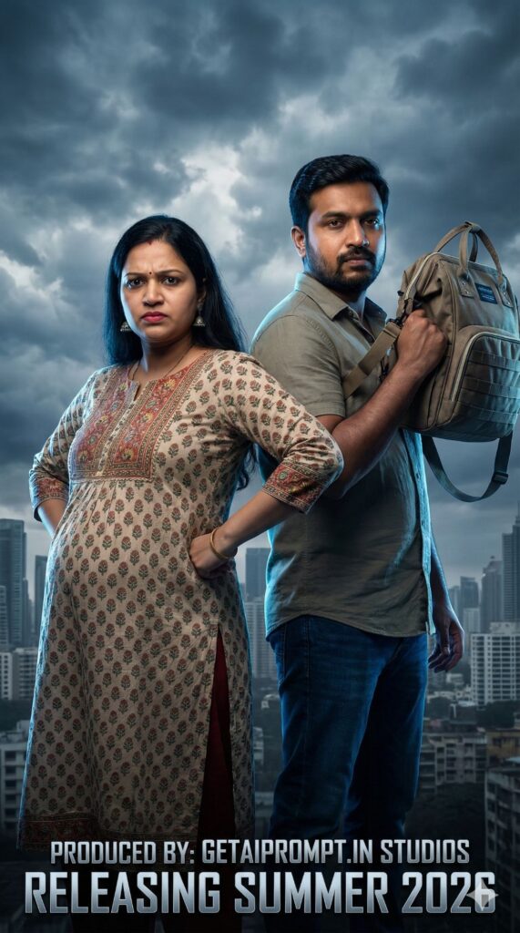 [CRITICAL: ensure the subjects have a 100% identical facial structure, skin tone, and features as the reference image provided] [SHOT TYPE: Low angle "Hero" shot] [SUBJECT:] The couple standing back-to-back like action heroes. The pregnant woman looks fierce; the husband looks ready for duty (holding a diaper bag like a weapon). [ACTION:] They are looking at the camera with intense "Movie Star" expressions. [BRANDING:] The text overlay at the bottom (Movie Credits style) lists "Produced by: GetAiPrompt.in Studios" and "Releasing Summer 2026". [ENVIRONMENT:] A dramatic cloudy sky background or a city skyline. [LIGHTING:] Dramatic "Rim Lighting" (Edge lighting), cool blue tones with warm skin highlights. [TECH SPECS:] Movie poster aesthetic, high sharpness, dramatic shadows, text integration, 8K. --ar 9:16
