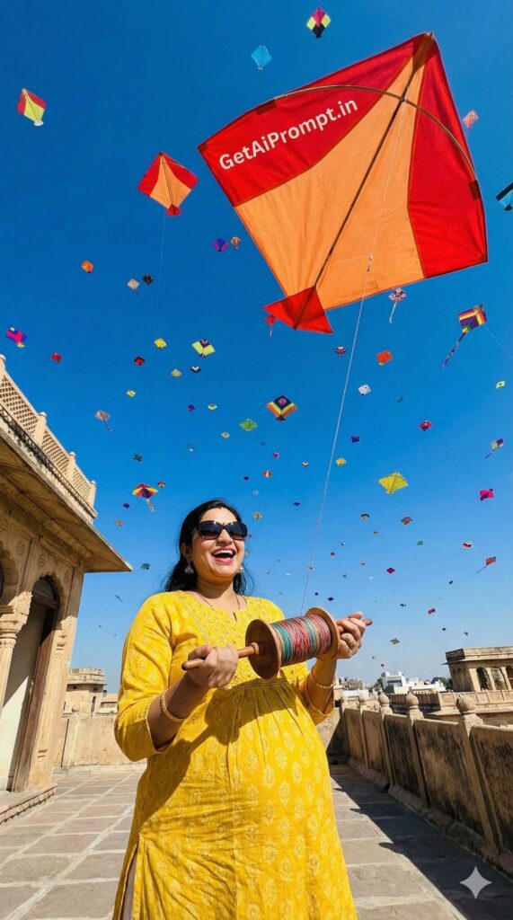 [CRITICAL: ensure the subjects have a 100% identical facial structure, skin tone, and features as the reference image provided] [SHOT TYPE: Low angle looking up at the sky] [SUBJECT:] A pregnant woman wearing sunglasses and a yellow kurta. [ACTION:] She is holding a spool (chakri) of thread, cheering as her husband (out of frame) flies a kite. The sky is full of colorful kites. [BRANDING:] The large kite nearest to the camera in the sky has the branding "GetAiPrompt.in" on its wing. [ENVIRONMENT:] An open terrace in Gujarat or Rajasthan. [LIGHTING:] bright, harsh sunny day, deep blue sky. [TECH SPECS:] Vibrant colors, wide angle lens, high depth of field keeping both subject and kites in focus, 8K. --ar 9:16