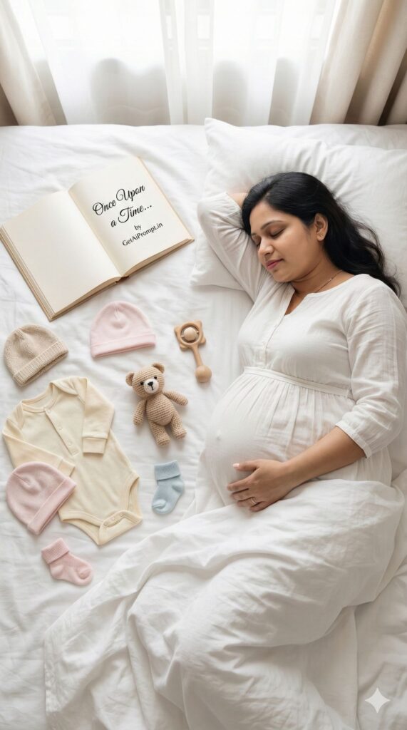 [CRITICAL: ensure the subjects have a 100% identical facial structure, skin tone, and features as the reference image provided] [SHOT TYPE: Top-down view (Flat lay style) on a bed] [SUBJECT:] The pregnant woman lying on a bed, surrounded by baby clothes, toys, and a storybook. [ACTION:] She is asleep (napping), hand on her bump, looking peaceful. [BRANDING:] The cover of the open storybook next to her reads "Once Upon a Time... by GetAiPrompt.in". [ENVIRONMENT:] White rumpled bedsheets, soft morning light. [LIGHTING:] High-key, white, pure, soft diffused window light. [TECH SPECS:] Lifestyle photography, clean aesthetic, soft pastel tones, peaceful atmosphere, 8K. --ar 9:16